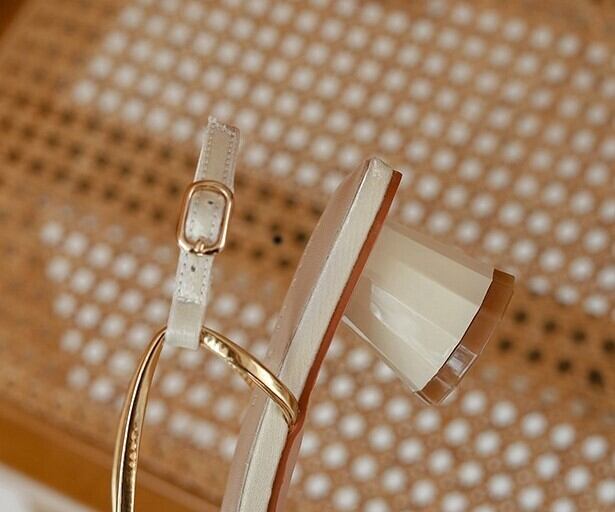 サテン素材の光沢感が上品さを演出し、細ストラップが足元を華やかに彩るサンダル。