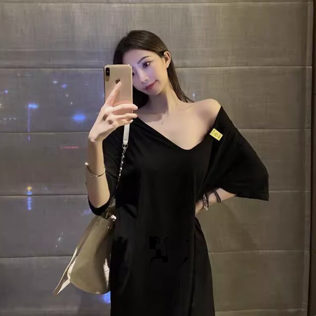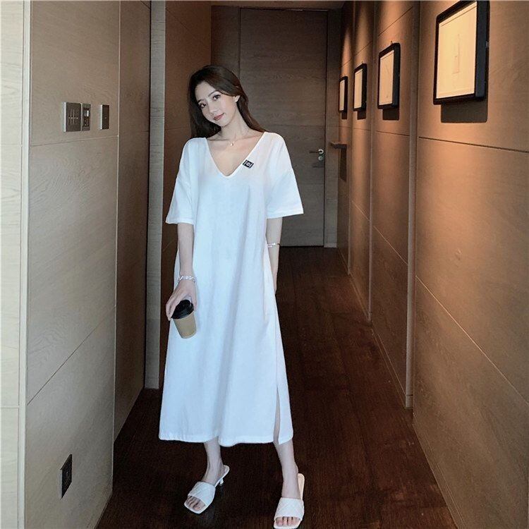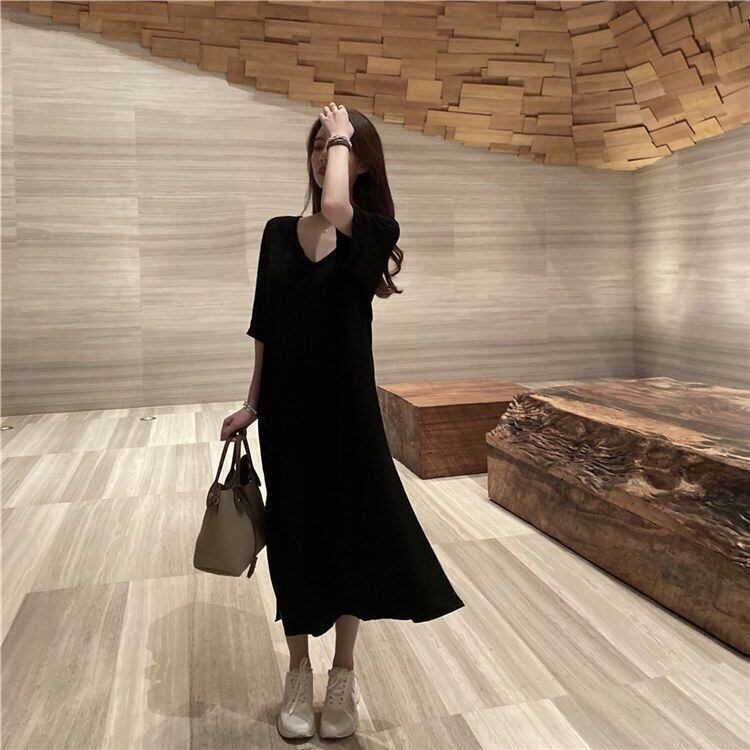 ワンピース レディース 膝下 ロング 半袖 5分袖 ボリューム袖 ドロップショルダー Vネック ワイド ストレート Aライン 背中開き フェミニン サイドスリット バックコンシャス 伸縮性 ポリエステル 無地 夏 デート お出かけ お泊まり リゾート 海 プール ビーチ 休日 バカンス ホテル モノトーン 重ね着 お揃い 双子 コーデ 楽ちん 体型カバー 普段使い 着回し レイヤード トレンド M L XL 2XL 3XL 4XL 大きいサイズ ビッグ ゆったり ゆる 白 ホワイト 黒 ブラック
