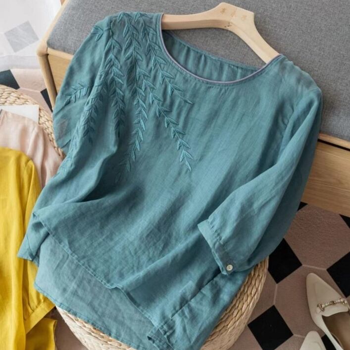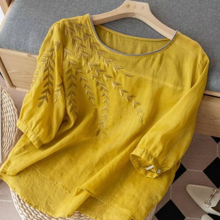 トップス シャツ ブラウス プルオーバー ミディアム丈 5分袖 ラウンドネック 刺繡 かわいい 大人可愛い きれいめ シンプル 上品 おしゃれ かっこいい レトロ きちんと こなれ感 個性的 主役級 存在感 抜け感 春 夏 秋 キュート ナチュラル ベーシック メンズライク 無地 レディース 女性用 ママ OL 通勤 オフィス 学生 通学 デート お出かけ お泊まり イベント 女子会 休日 アウトドア カフェ ショッピング レストラン コンパ レイヤード 重ね着 普段使い 着回し M L XL 2XL