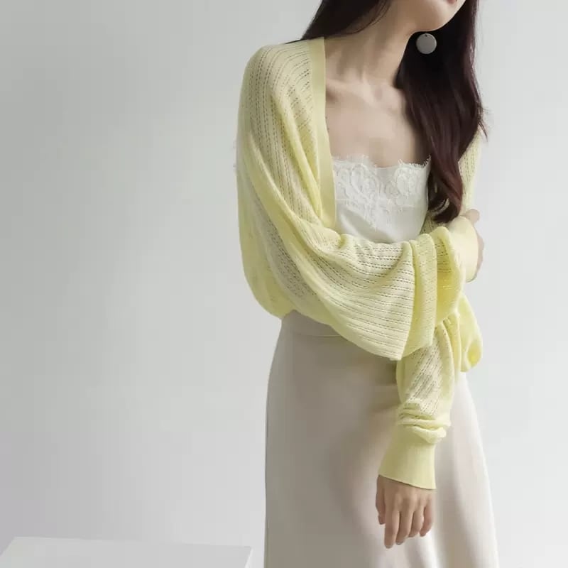 トップス カーディガン ショート丈 長袖 ボリューム袖 前開き 透け感 かわいい 大人可愛い きれいめ シンプル 上品 おしゃれ かっこいい レトロ きちんと こなれ感 個性的 主役級 存在感 抜け感 春 夏 秋 キュート ナチュラル ベーシック セクシー ガーリー 無地 レディース 女性用 ママ OL 通勤 オフィス 学生 通学 デート お出かけ お泊まり イベント 女子会 休日 アウトドア カフェ ショッピング レストラン コンパ レイヤード 重ね着 普段使い 着回し S M L XL 日焼け防止