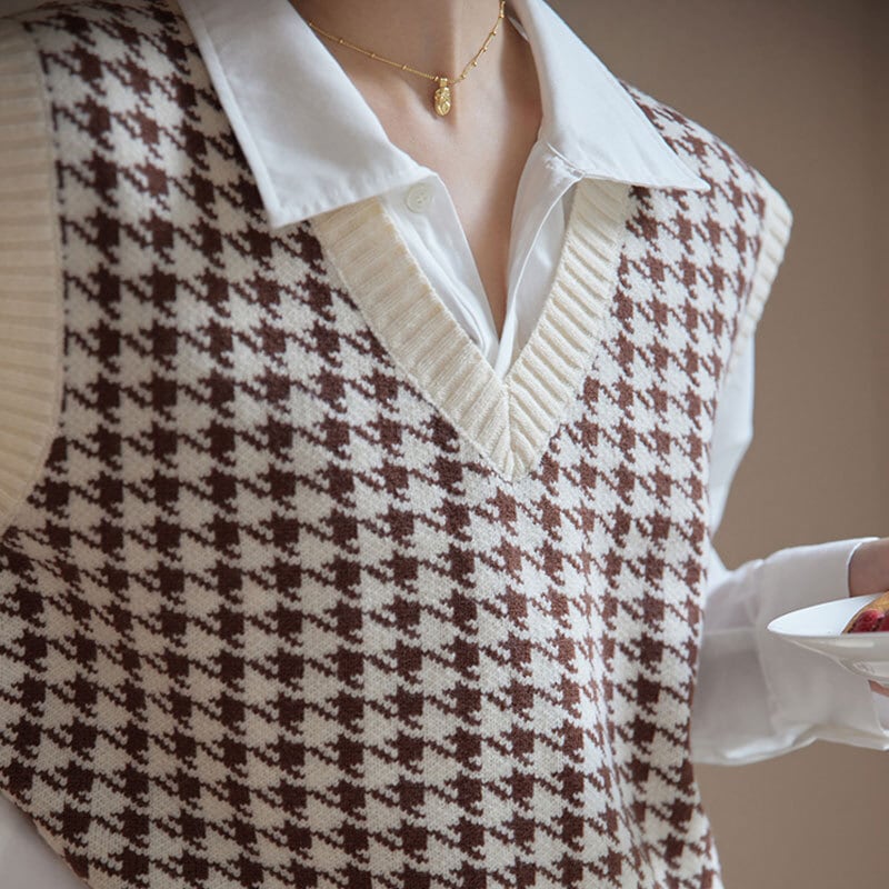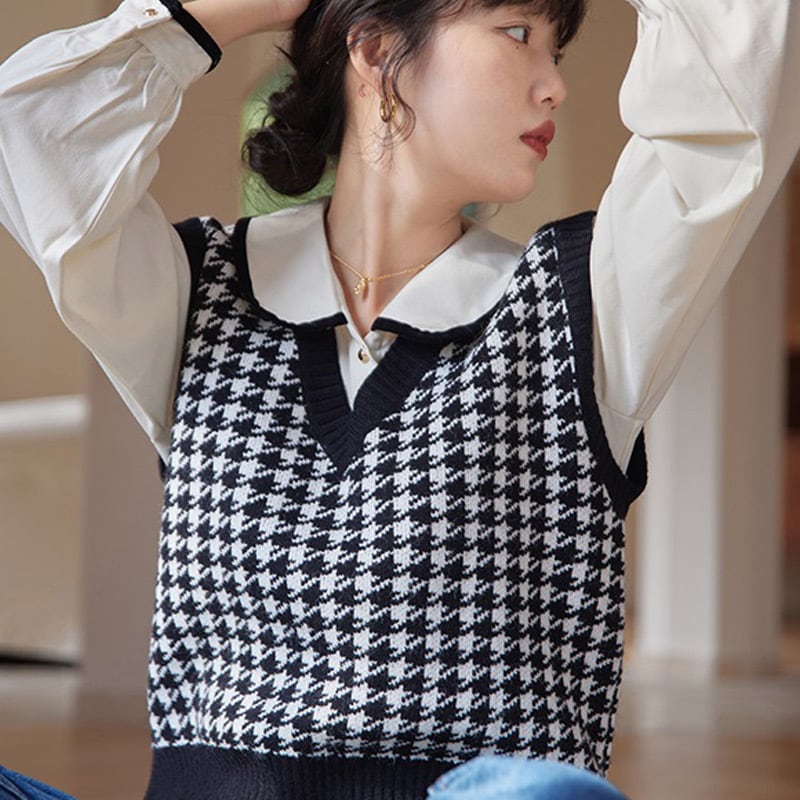 華やかな千鳥格子柄が目を引く、ニットベスト。