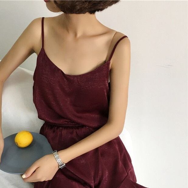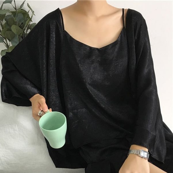 キャミソール、ショートパンツ、そしてウエストゴム付きのカーディガンがセットになっており、ナチュラルで上品な着こなしを演出します。