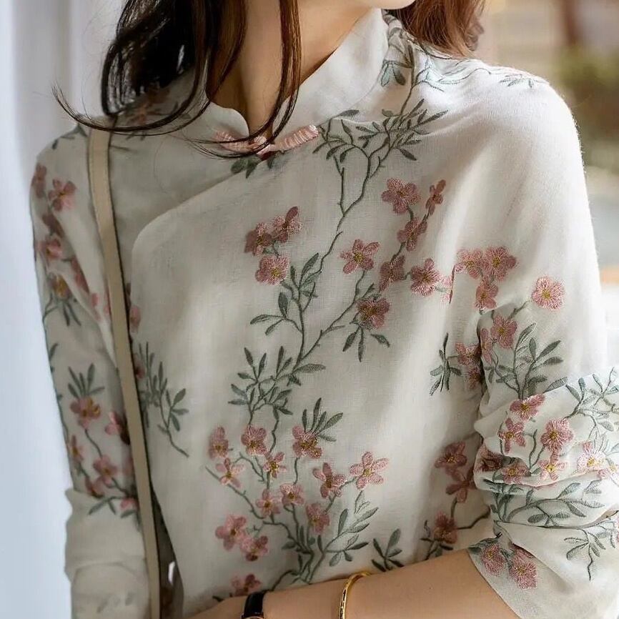 トップス ブラウス プルオーバー ミディアム丈 長袖 刺繡 チャイナ服 かわいい 大人 可愛い きれいめ シンプル 上品 おしゃれ かっこいい レトロ アジアン エスニック きちんと こなれ感 個性的 主役級 存在感 抜け感 春 夏 ナチュラル ベーシック キュート メンズライク レディース 女性用 ママ OL 通勤 学生 通学 デート お出かけ お泊まり イベント 女子会 休日 アウトドア カフェ ショッピング レストラン コンパ レイヤード 重ね着 パーティー 普段使い 着回し M L XL 2XL