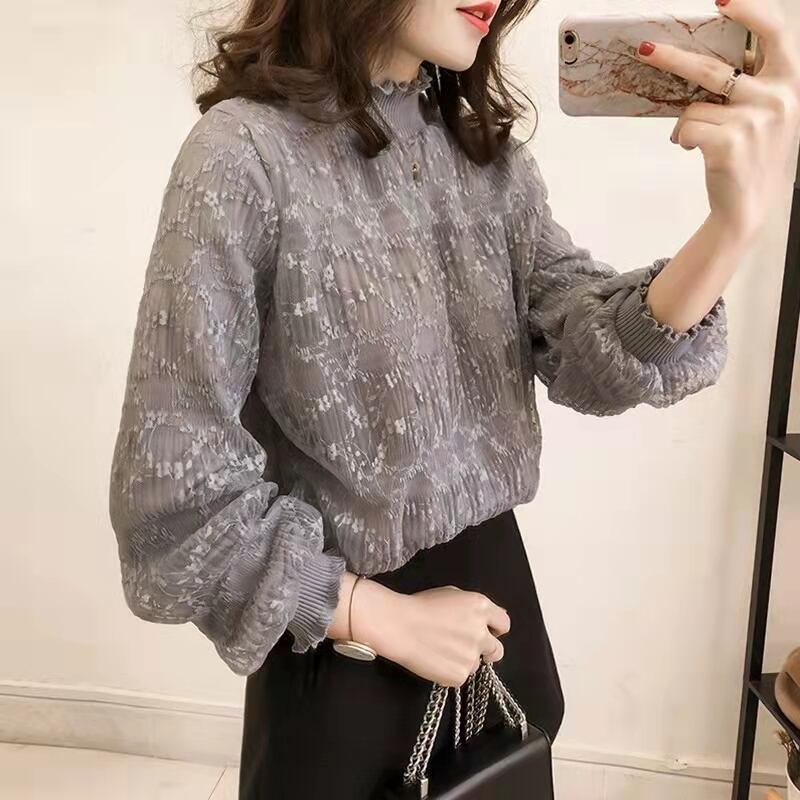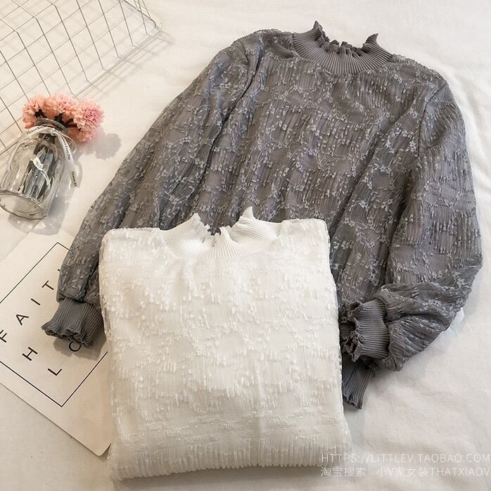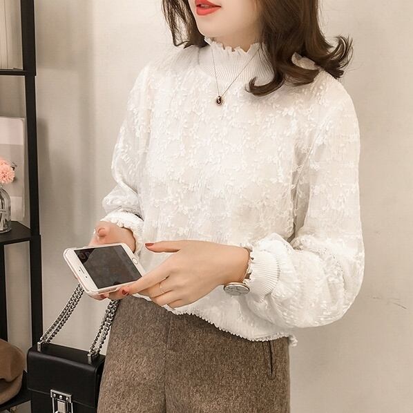 ボリューム袖が程よい華やかさをプラスし、ハイネックとフリルが上品な印象を与えます。
