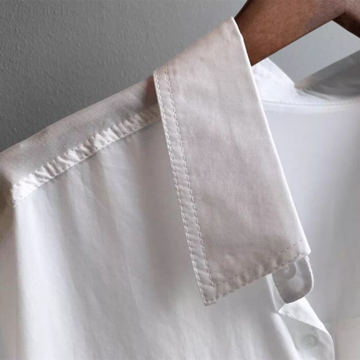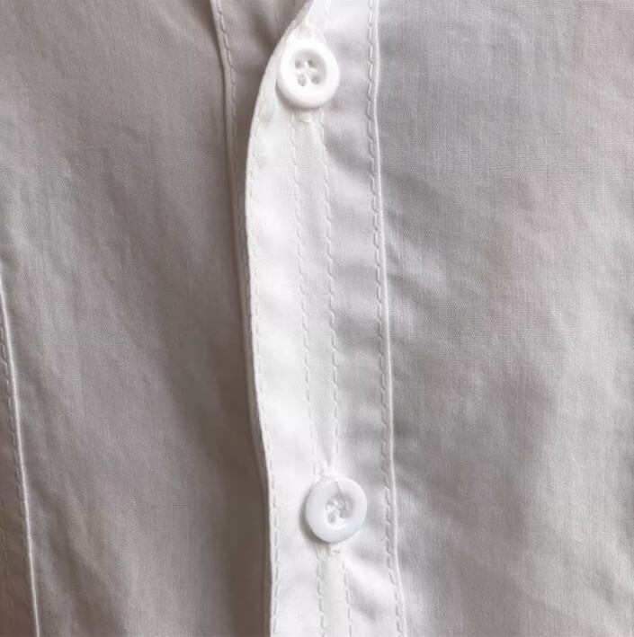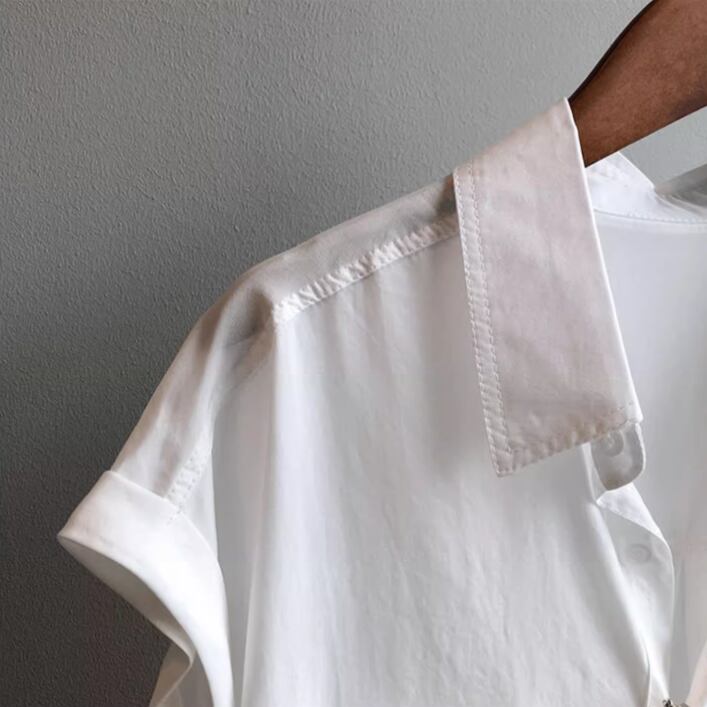 ゆったりとしたフレンチスリーブが女性らしさを引き立て、Vネックと襟が洗練された印象を与えます。