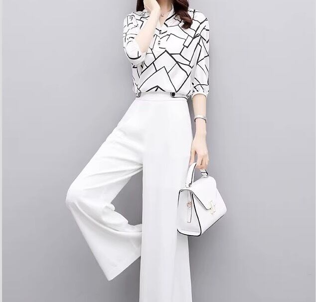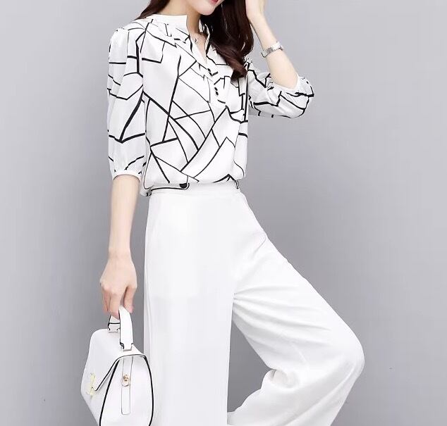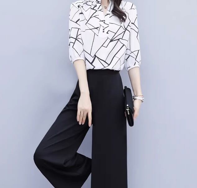 2点セットのレディーストップス&パンツセットアップは、モダンでシンプル、そしてエレガントなスタイルを演出します。Vネックの白トップスと、ストレートラインが美しいワイドパンツの組み合わせは、上品ながらもカジュアルな雰囲気を醸し出します。五分袖のボリューム袖が女性らしさを引き立て、Iラインのシルエットはスタイルアップ効果も期待できます。