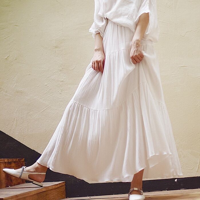流行のフレアスカートでウエストゴムでラクチンな着心地が魅力のロングスカートです。