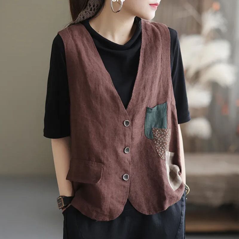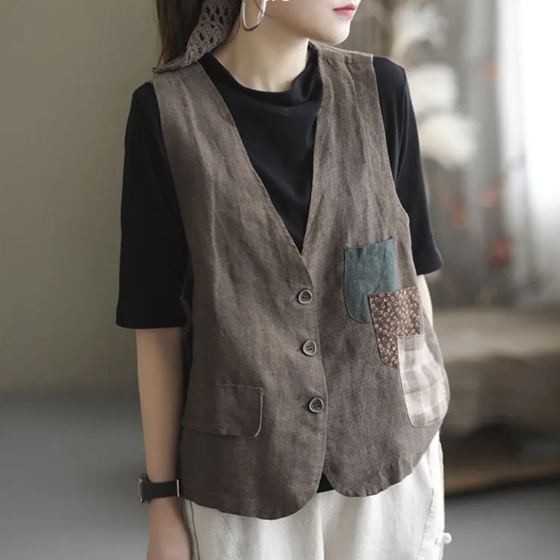 このトップスはベストのショート丈デザインで、Vネックと前開きのボタンがアクセント。