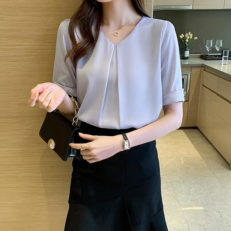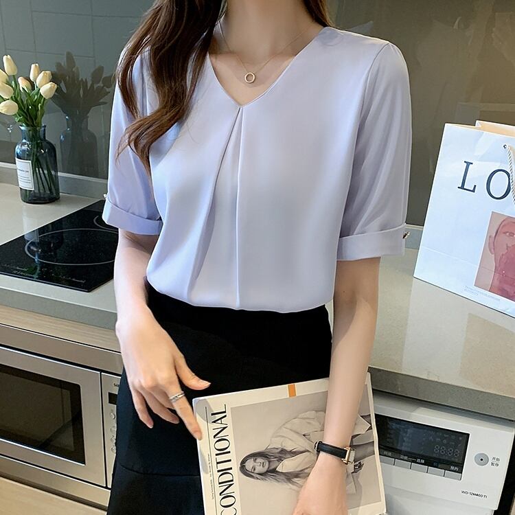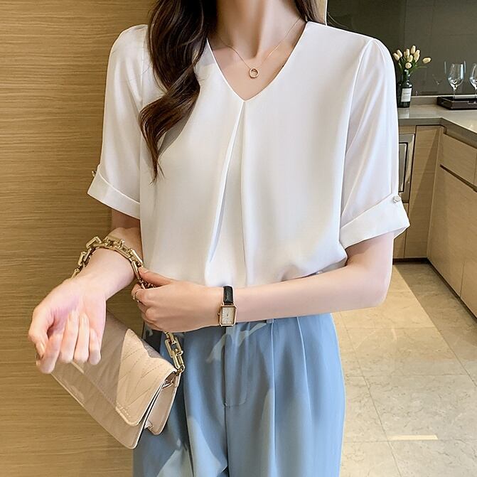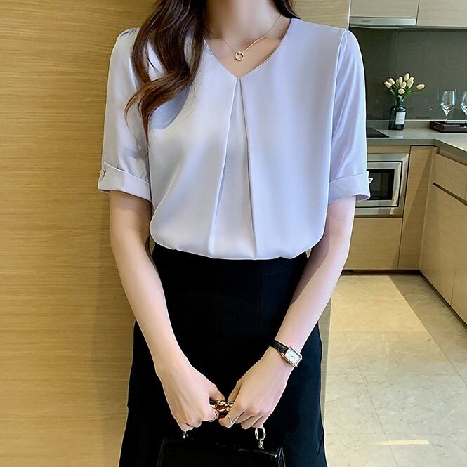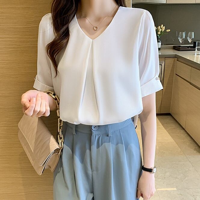 トップス シャツ シフォンシャツ プルオーバー ミディアム丈 5分袖 Vネック かわいい 大人可愛い きれいめ シンプル 上品 おしゃれ かっこいい レトロ きちんと こなれ感 個性的 主役級 存在感 抜け感 春 夏 キュート ナチュラル ベーシック フォーマル エレガント 無地 レディース 女性用 ママ OL 通勤 オフィス 学生 通学 デート お出かけ お泊まり イベント 女子会 休日 アウトドア カフェ ショッピング レストラン コンパ レイヤード 重ね着 普段使い 着回し S M L XL