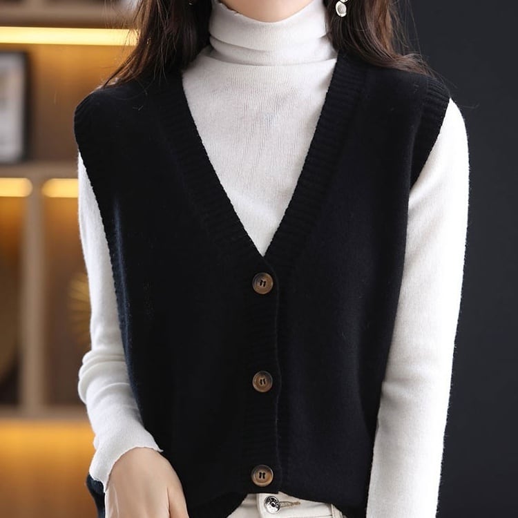 鮮やかなVネックデザインと前開きのボタンが特徴のミディアム丈ベスト。