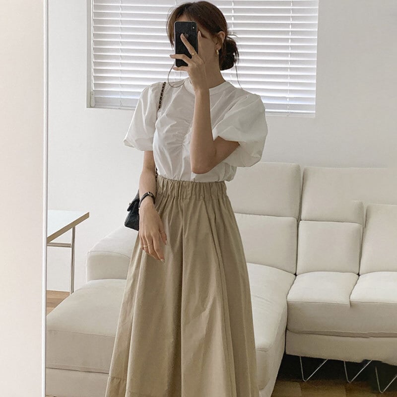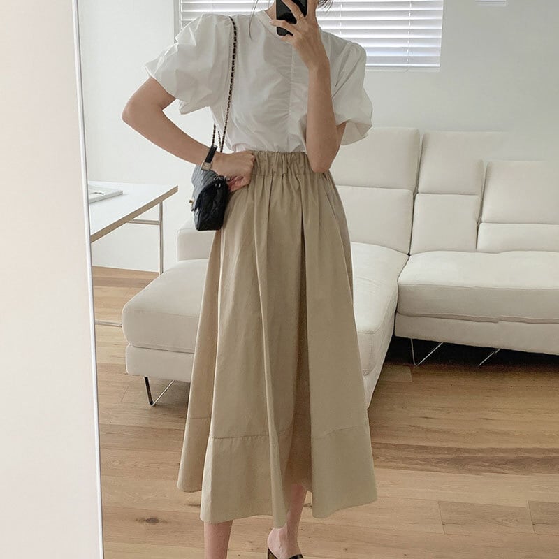 このハイウエストミモレ丈スカートは、セミフレアのデザインが大人可愛さを引き立てます。