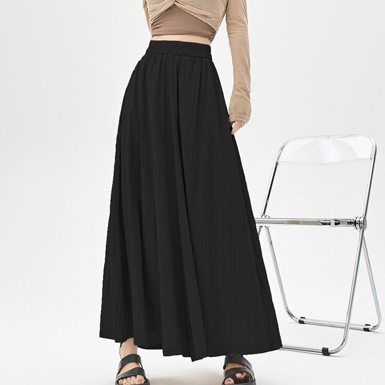 シンプルでありながら存在感を放つ、ウエストゴム仕様のワイドパンツ。