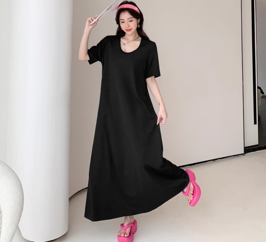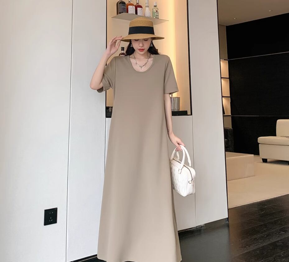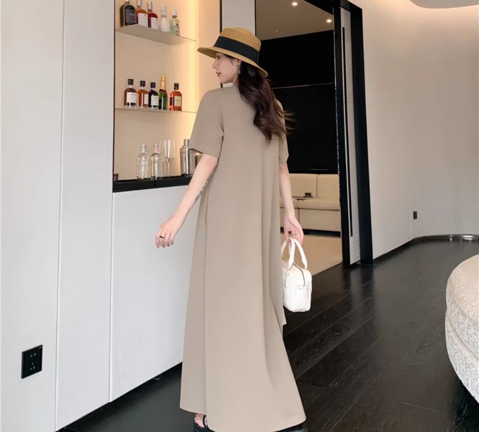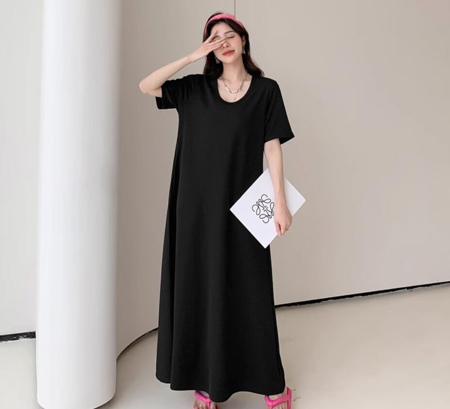 ワンピース ロング丈 袖あり 半袖 ラウンドネック Aライン ポケット 伸縮性 綿 ポリエステル シンプル カジュアル ルーズ 無地 春 夏 10代 20代 30代 40代 レディース 女性用 ママ マタニティ お出かけ 休日 旅行 着回し 普段使い 重ね着 楽ちん 体型カバー 定番 L XL 2XL ゆったり ゆる 黒 ブラック カーキ