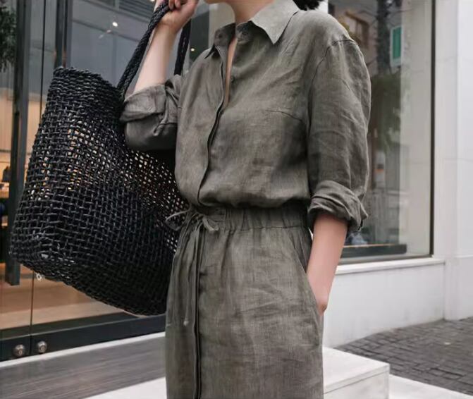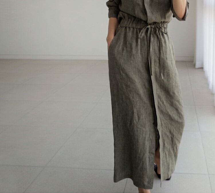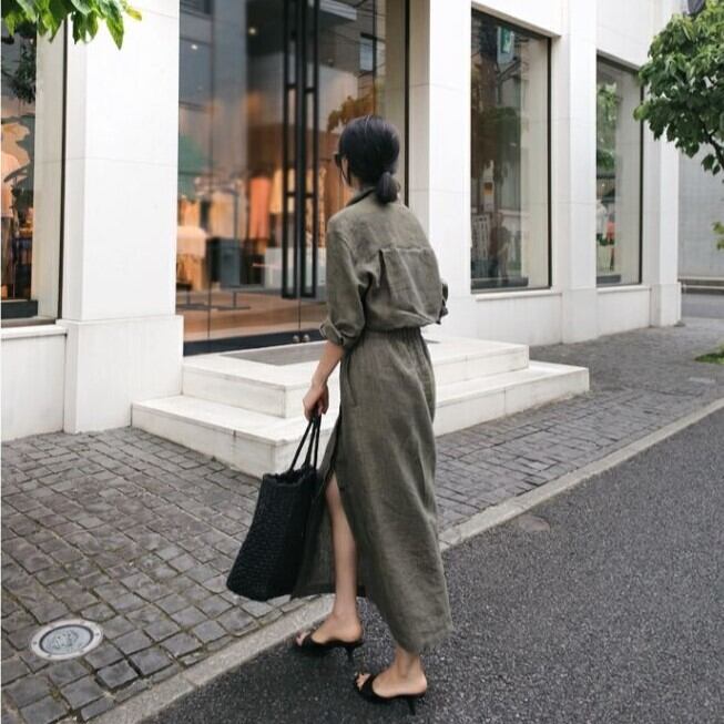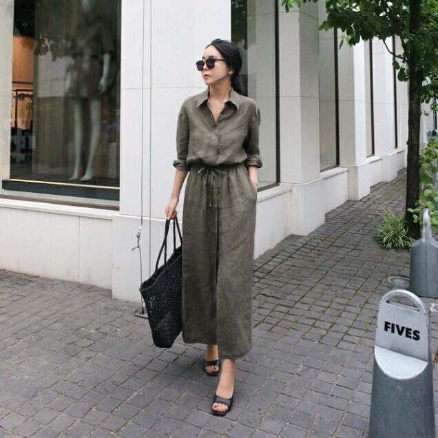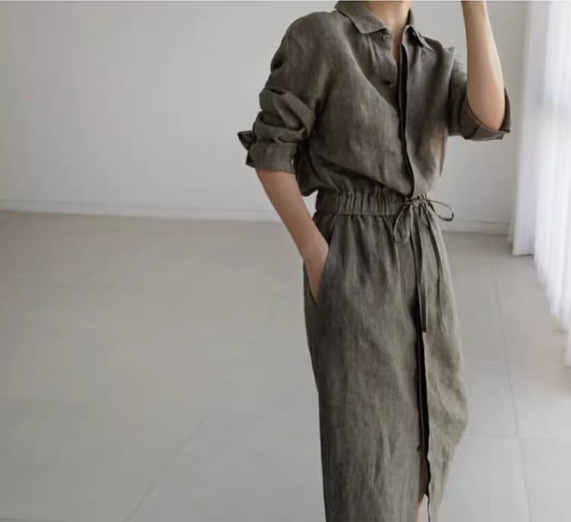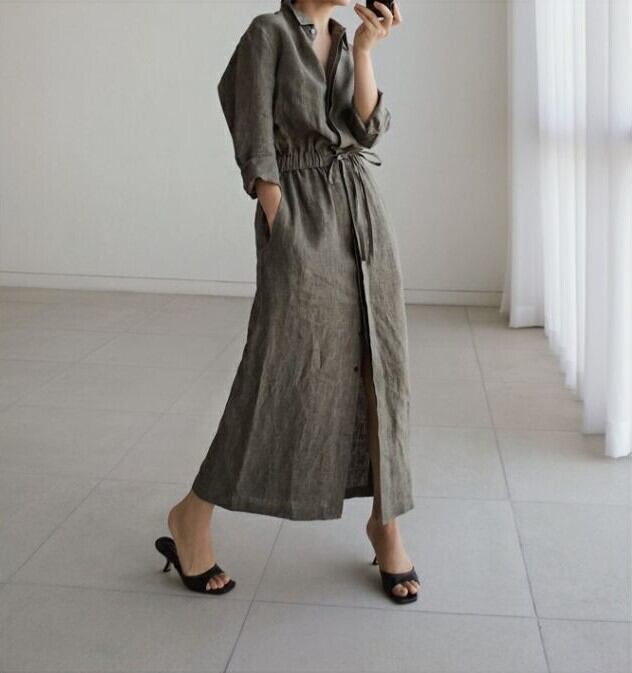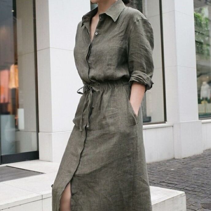 ワンピース レディース シャツワンピ ロング 長袖 襟付き 比翼仕立て 隠しボタン セミフレア 切り替え ウエストマーク ウエストリボン スリット ポケット ウエストゴム ボタン リネン 綿 コットン 麻 大人可愛い シンプル カジュアル 上品 おしゃれ かっこいい こなれ感 ラフ クール 抜け感 都会的 無地 春 夏 秋 デート お出かけ リゾート 旅行 レストラン 女子会 休日 高原 ホテル ショッピング カフェ ランチ会 重ね着 楽ちん 普段使い 着回し レイヤード S M L XL ワンカラー