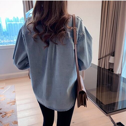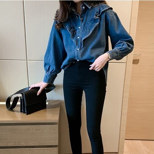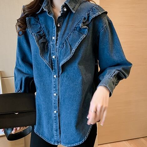 トップス シャツ デニムシャツ ミディアム丈 長袖 角襟 前開き ボタン フリル かわいい 大人可愛い きれいめ シンプル 上品 おしゃれ かっこいい レトロ きちんと こなれ感 個性的 主役級 存在感 抜け感 オールシーズン キュート ナチュラル ベーシック ガーリー 無地 レディース 女性用 ママ OL 通勤 オフィス 学生 通学 デート お出かけ お泊まり イベント 女子会 休日 アウトドア カフェ ショッピング レストラン コンパ レイヤード 重ね着 普段使い 着回し M L XL 2XL