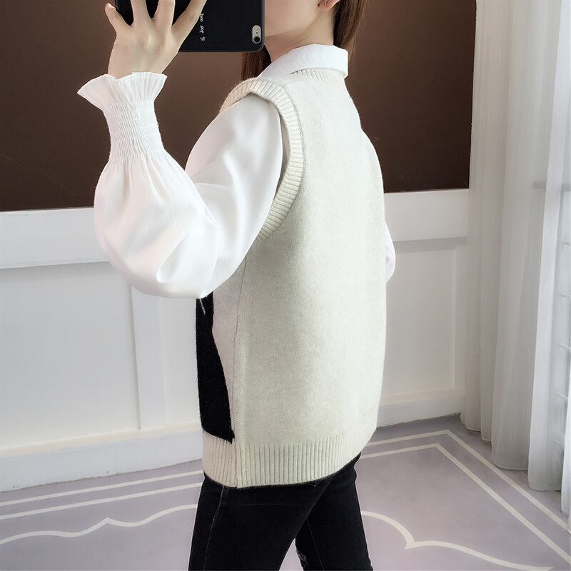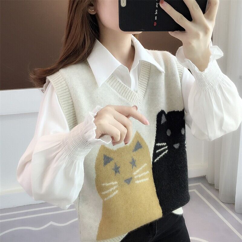 2点セット トップス シャツ ニットベスト ミディアム丈 長袖 襟付き Vネック かわいい 大人可愛い きれいめ シンプル 上品 おしゃれ かっこいい レトロ きちんと こなれ感 個性的 主役級 存在感 抜け感 秋 冬 キュート ナチュラル ベーシック レディース メンズライク 無地 アニマル柄 女性用 ママ OL 通勤 オフィス 学生 通学 デート お出かけ お泊まり イベント 女子会 休日 アウトドア カフェ ショッピング レストラン コンパ レイヤード 重ね着 普段使い 着回し S M L XL