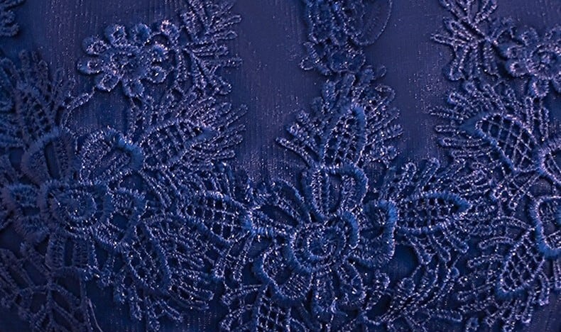 美しいフラワーレースと透け感のあるチュールがエレガントな印象を与えるロングドレス。