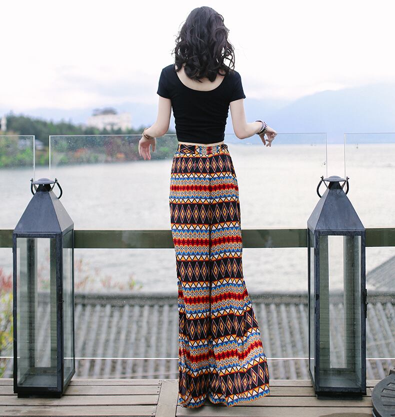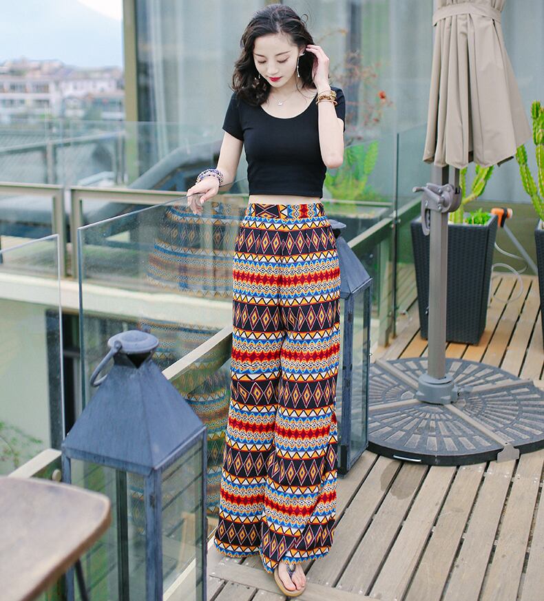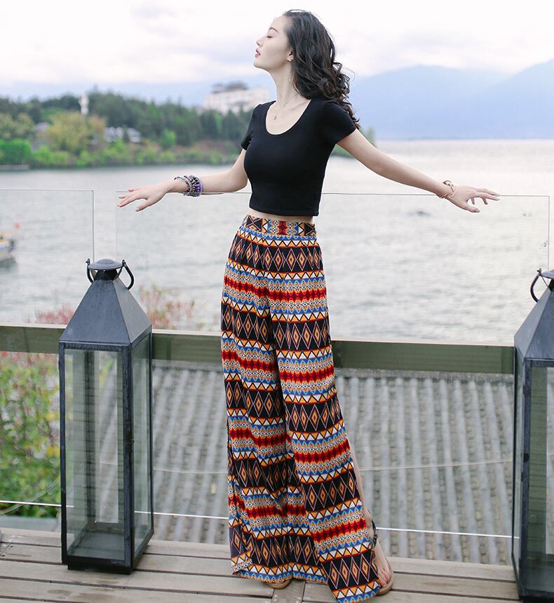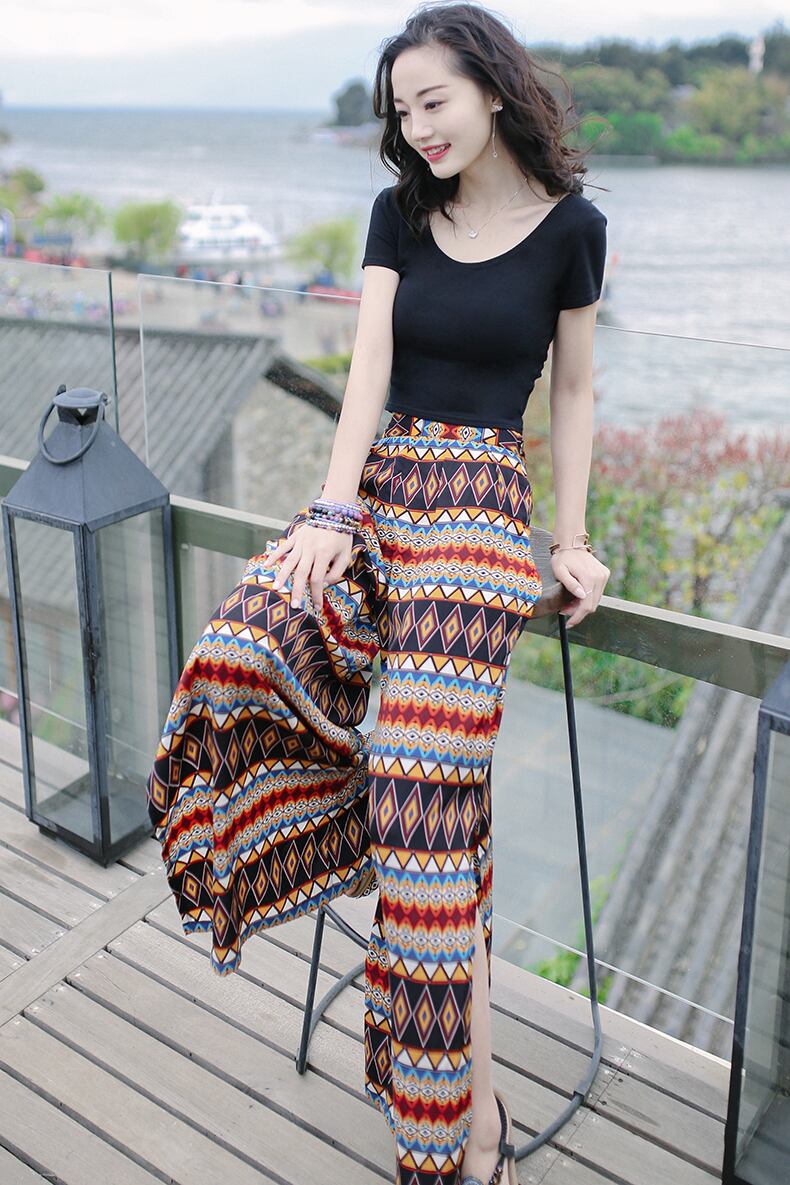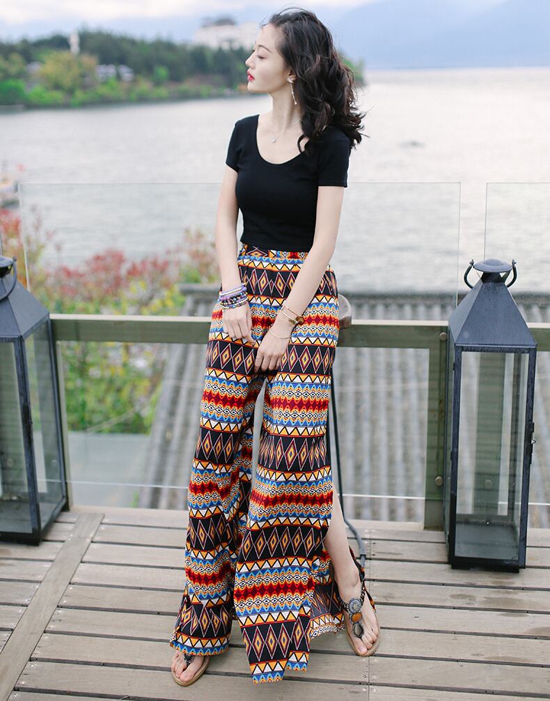 夏のオシャレにピッタリなエスニックワイドパンツ!自然を感じさせるエスニック柄が目を引く一枚。ハイウエストで脚長効果も抜群!足首にはスリットが入っているので、歩くたびに軽やかなエスニックスタイルを演出します。