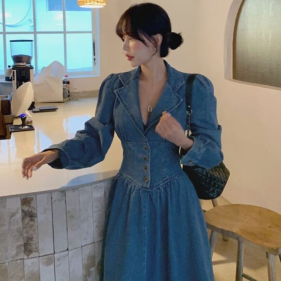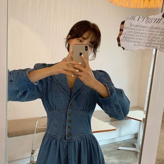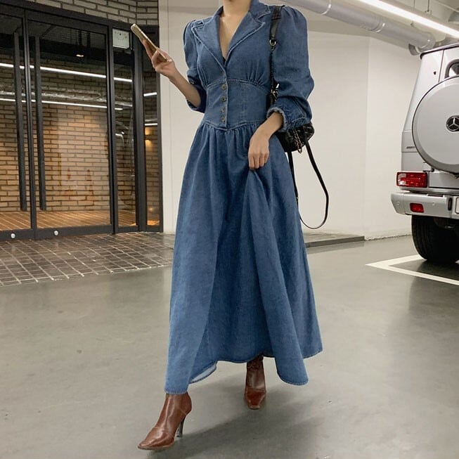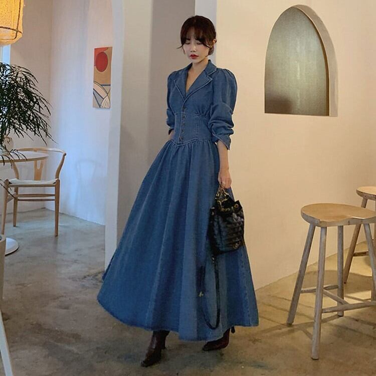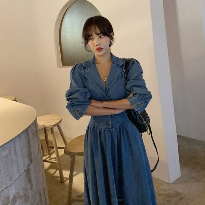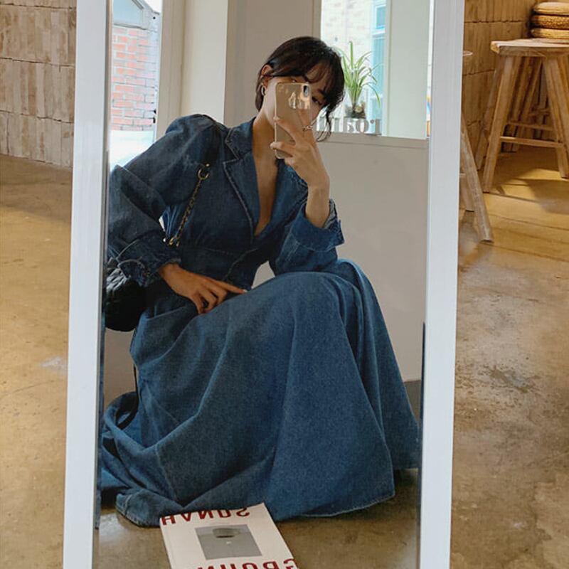 レディース ワンピース ドレス デニム ロング 長袖 Vネック フレア Aライン ハイウエスト かわいい 大人可愛い きれいめ シンプル カジュアル 上品 おしゃれ こなれ感 ガーリー 個性的 ラブリー キュート 無地 春 秋 デート お出かけ イベント 女子会 ショッピング 韓国 コーデ 脚長 普段使い 着回し モテ トレンド 流行 インスタ映え S M L XL ブルー