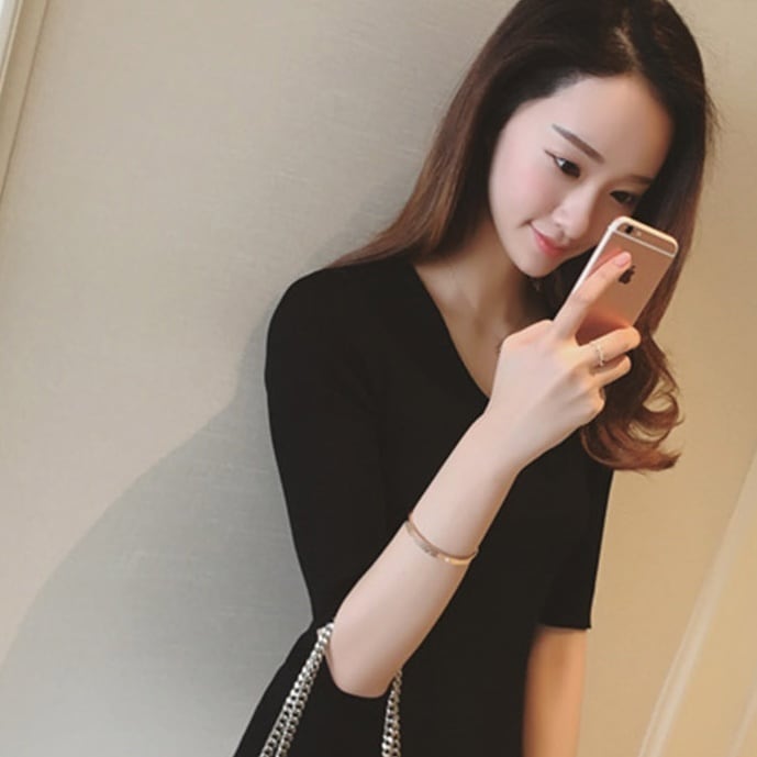 シンプルなデザインながら、Vネックが首元を華やかに演出してくれます。
