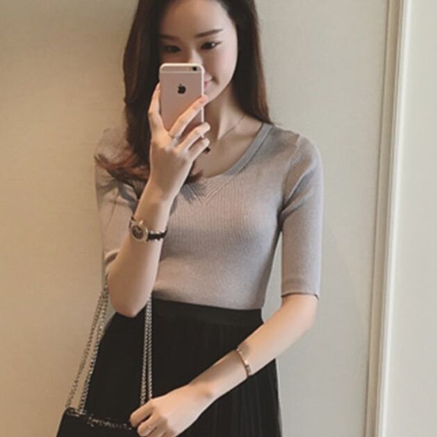 トップス ニットソー プルオーバー ミディアム丈 5分袖 Vネック ニット タイト かわいい 大人可愛い きれいめ シンプル 上品 おしゃれ かっこいい レトロ きちんと こなれ感 個性的 主役級 存在感 抜け感 オールシーズン キュート ナチュラル ベーシック 無地 レディース 女性用 ママ OL 通勤 オフィス 学生 通学 デート お出かけ お泊まり イベント 女子会 休日 アウトドア カフェ ショッピング レストラン コンパ レイヤード 重ね着 普段使い デイリー 着回し S M L XL