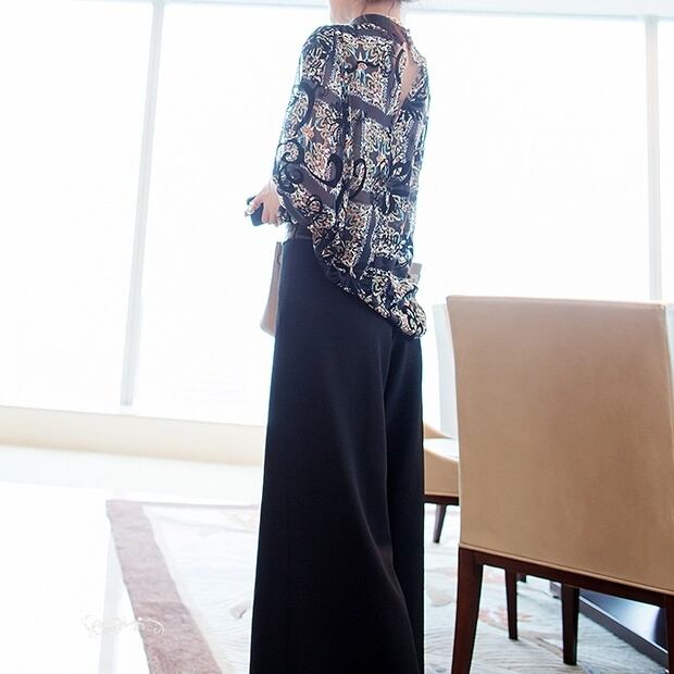 7分袖の透け感あるブラウスとロング丈のパンツで、大人可愛い雰囲気を演出します。