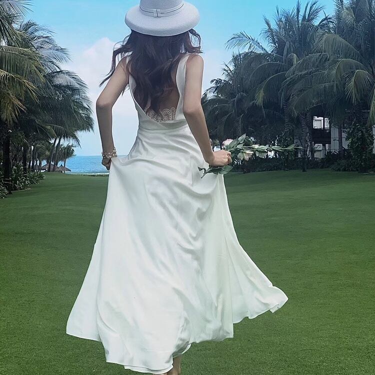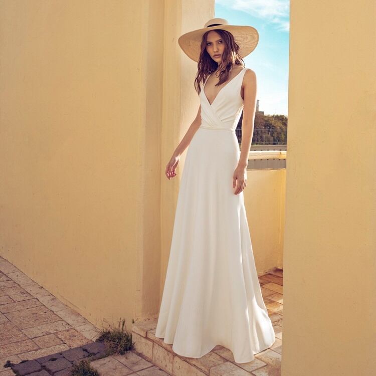 ノースリーブで腕をスッキリ見せ、深いVネックが女性らしい胸元を演出します。