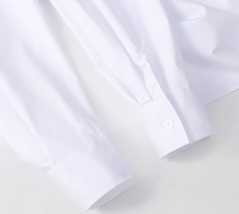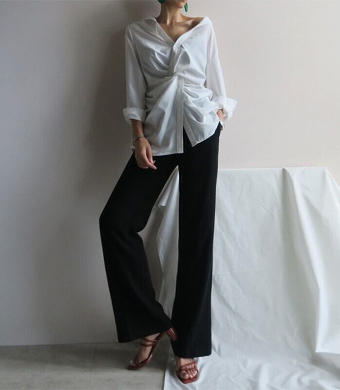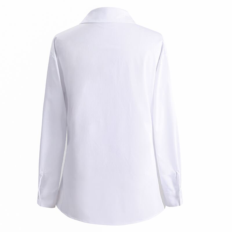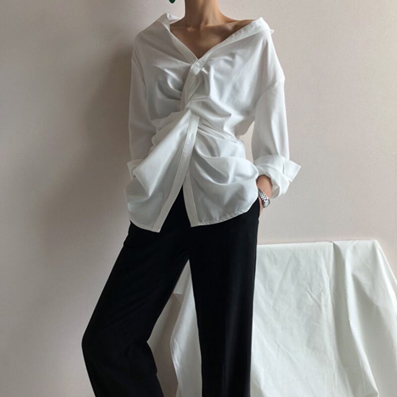 清潔感のあるホワイトシャツで、いつものコーディネートを格上げしませんか?Vネックラインが女性らしさを引き立て、クロスデザインでスリムなシルエットスタイルを美しく見せてくれます。
