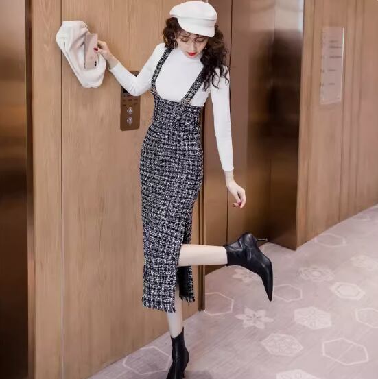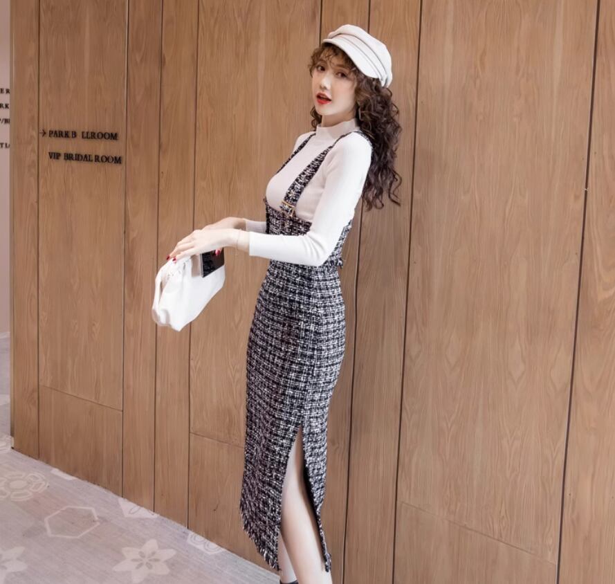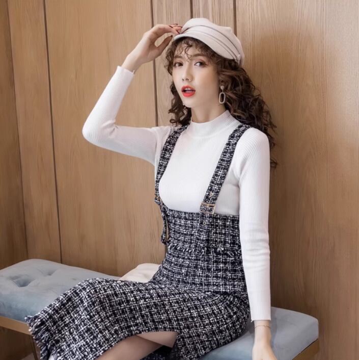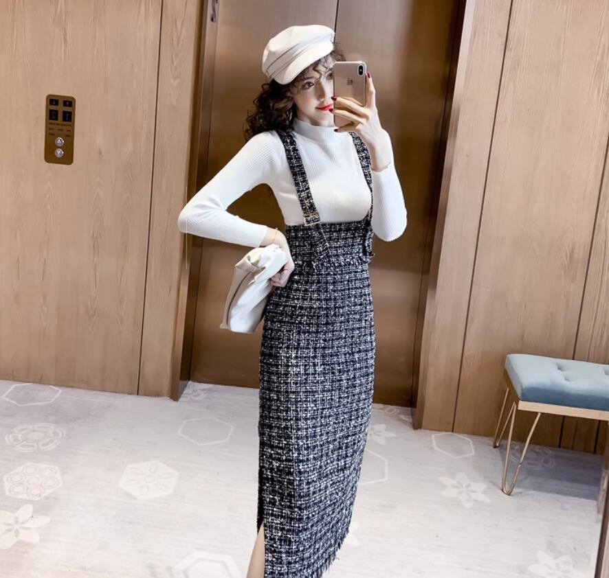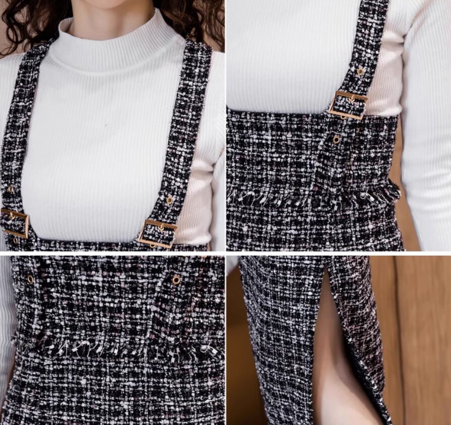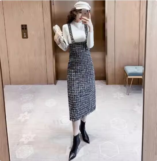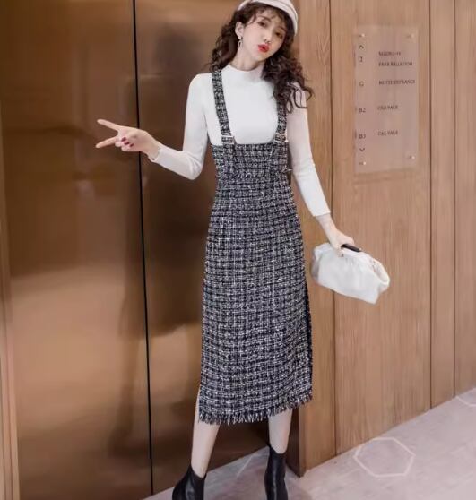 ワンピース ジャンパースカート 膝下 袖なし スクエアネック スリム ストレート Iライン サイドスリット バックシャン かわいい 大人可愛い きれいめ 上品 おしゃれ お洒落 チェック柄 秋 冬 20代 30代 40代 レディース 女性用 ママ デート お出かけ 休日 着回し 普段使い 重ね着 体型カバー S M L XL 黒 ブラック