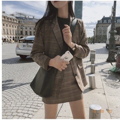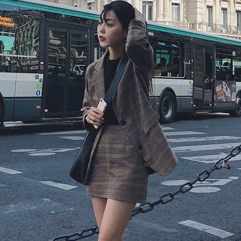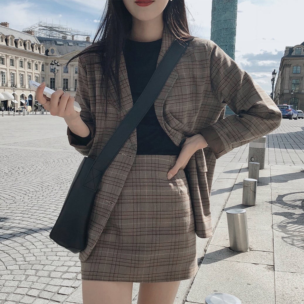 ミディアム丈のジャケットとAラインのミニスカートが、女性らしいシルエットを作り出します。