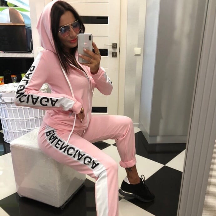 ファスナー付きの前開きデザインとフードが付いた長袖トップスと、ウエストゴムで楽ちんなロングパンツの2点セットです。