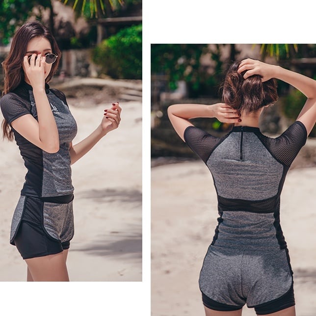 パッド付きでバストもしっかりホールドし、半袖のデザインで二の腕のカバーもバッチリ。