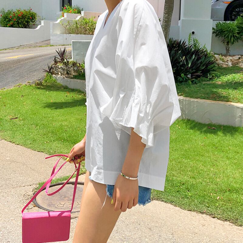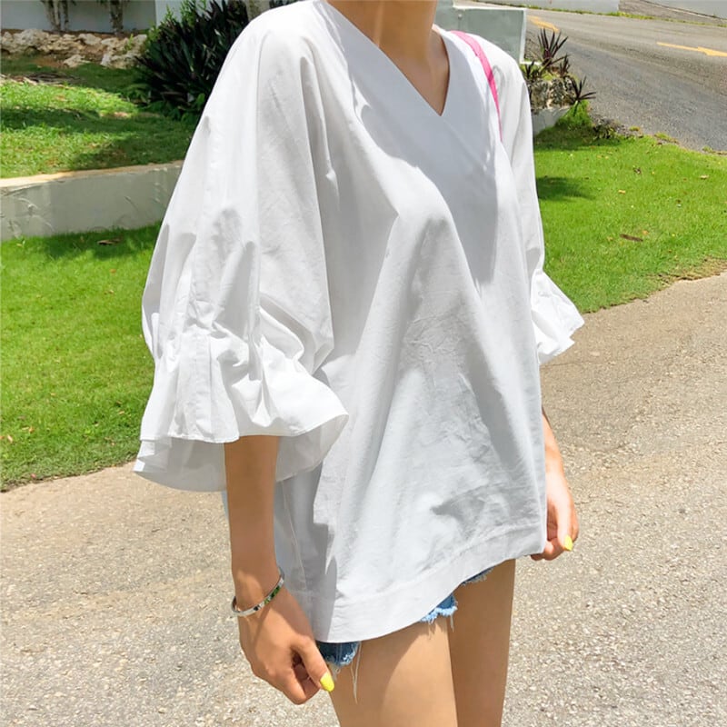トップス シャツ プルオーバー ミディアム丈 5分袖 袖フリル Vネック かわいい 大人可愛い きれいめ シンプル 上品 おしゃれ かっこいい カジュアル レトロ きちんと こなれ感 個性的 主役級 存在感 抜け感 オールシーズン キュート ナチュラル ベーシック ガーリー 無地 レディース 女性用 ママ OL 通勤 学オフィス 学生 通学 デート お出かけ お泊まり イベント 女子会 休日 アウトドア カフェ ショッピング レストラン コンパ レイヤード 重ね着 普段使い 着回し S M L XL