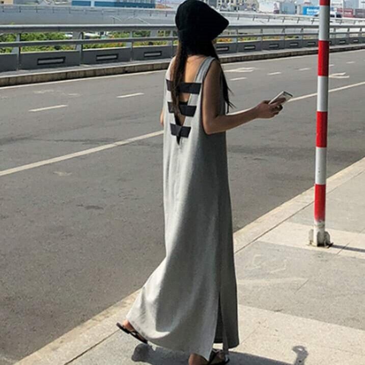 レディース ワンピース ロングスカート ロング ノースリーブ ラウンドネック ストレート 背中開き スリット かわいい 大人可愛い きれいめ シンプル カジュアル おしゃれ こなれ感 ラフ ガーリー ラブリー キュート 無地 夏 学生 学校 デート お出かけ リゾート 旅行 海 プール ビーチ 女子会 韓国 コーデ 楽ちん 脚長 普段使い 着回し モテ トレンド 流行 インスタ映え S M L XL ゆったり グレー