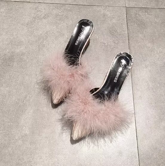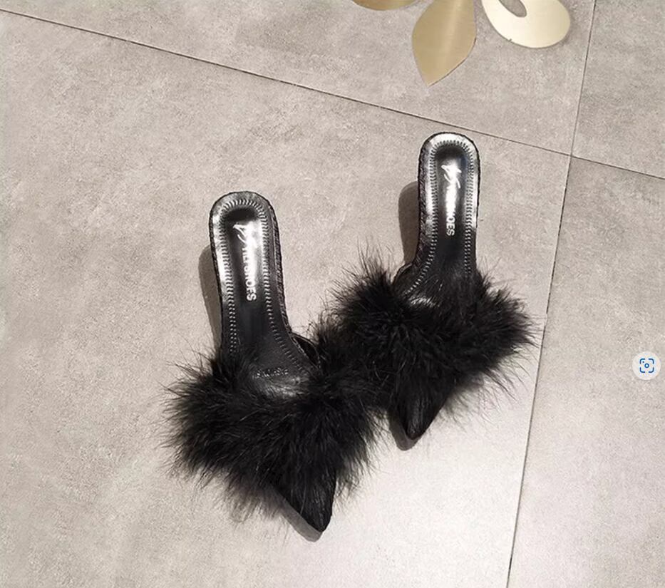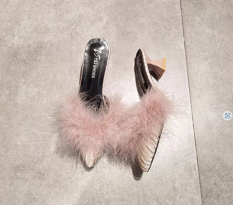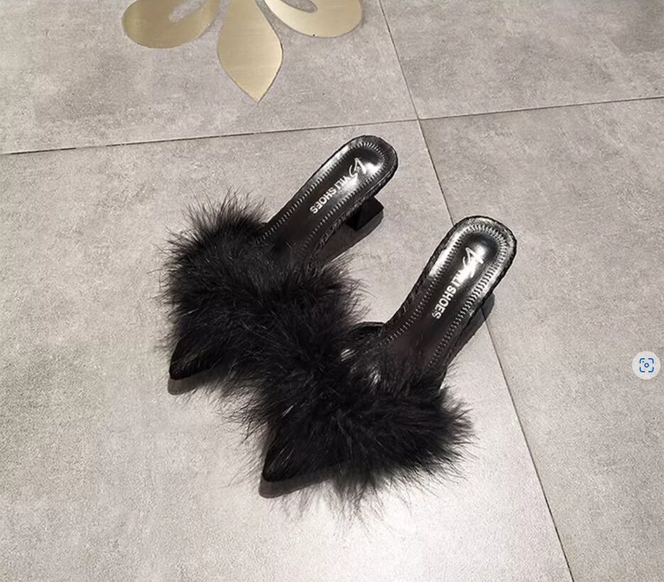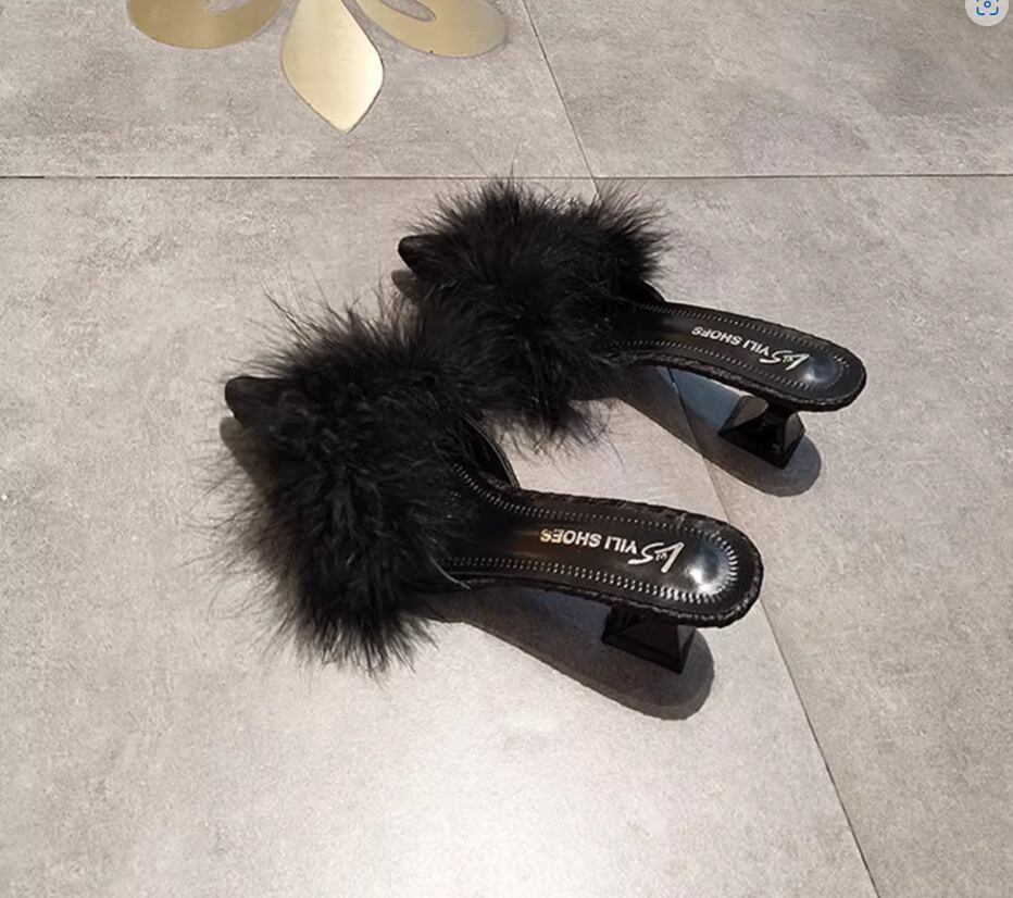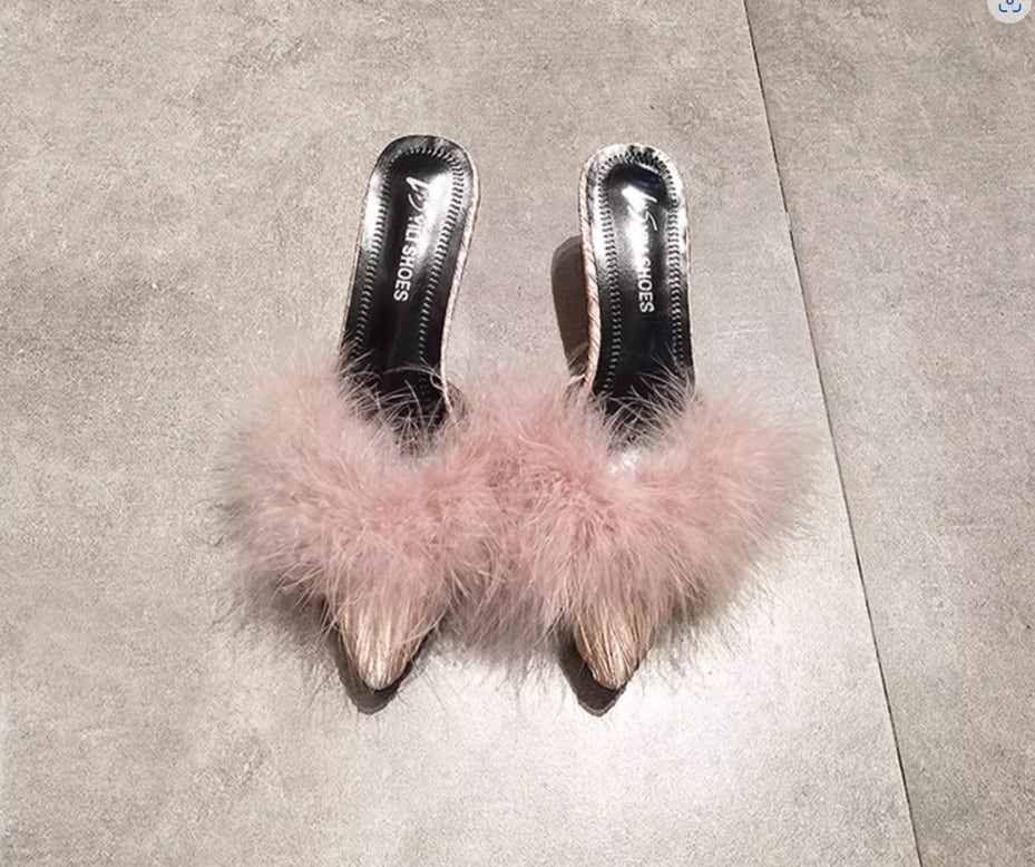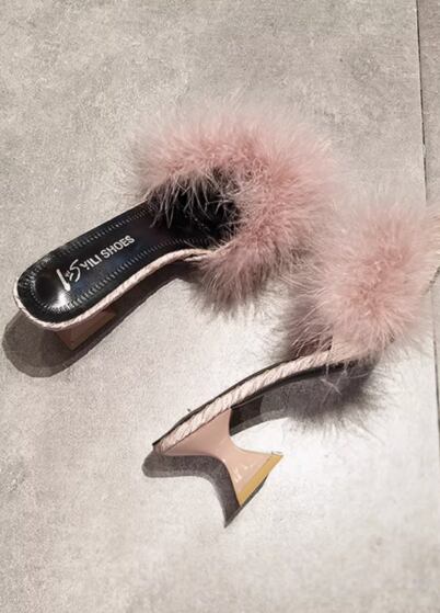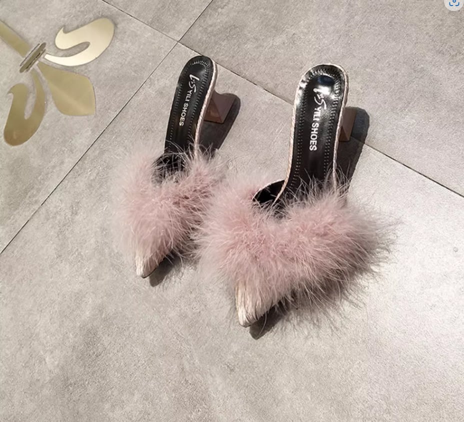 ふわふわのファーが目をひく太ヒールタイプのミュール