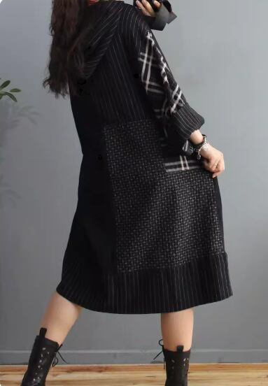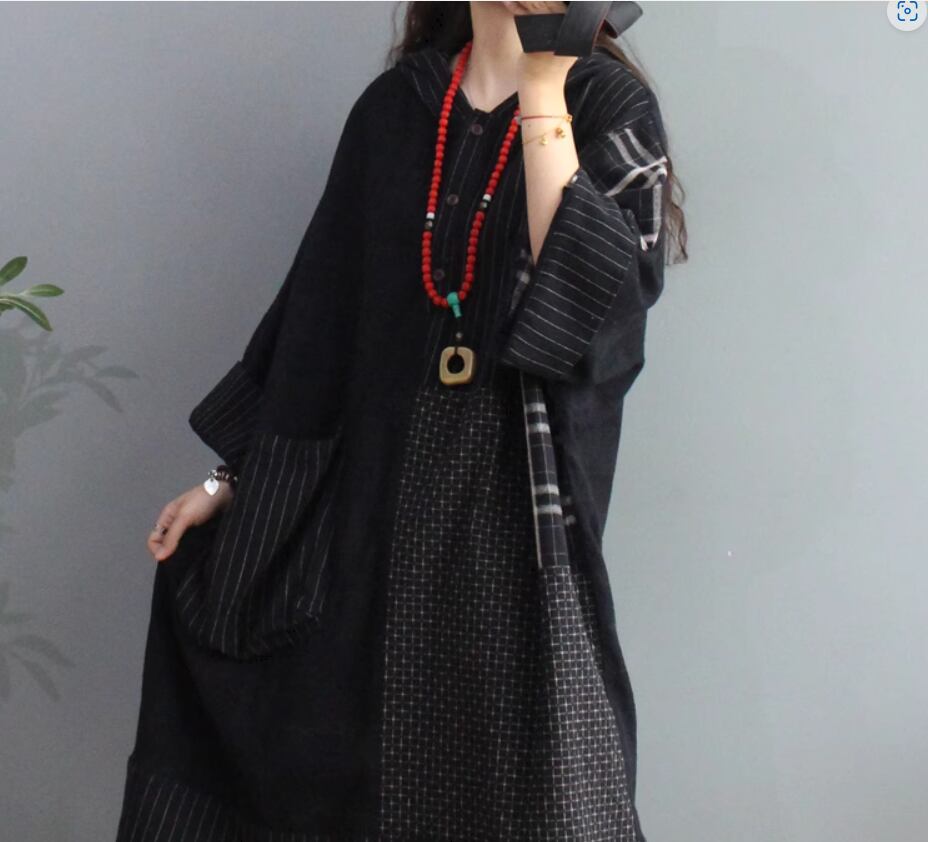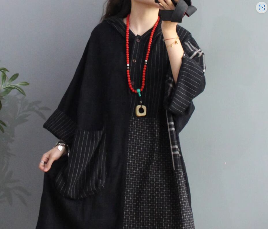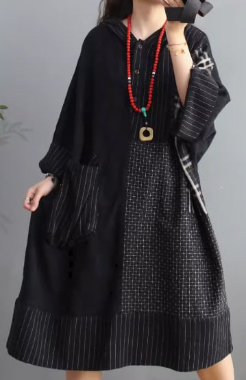ワンピース 膝丈 ひざ丈 袖あり 長袖 ボリューム袖 Aライン 切り替えデザイン フード付き 綿 カジュアル レトロ 個性的 無地 柄 ストライプ 春 秋 10代 20代 30代 40代 レディース 女性用 お出かけ 普段使い 楽ちん 体型カバー フリーサイズ ゆったり 黒 ブラック
