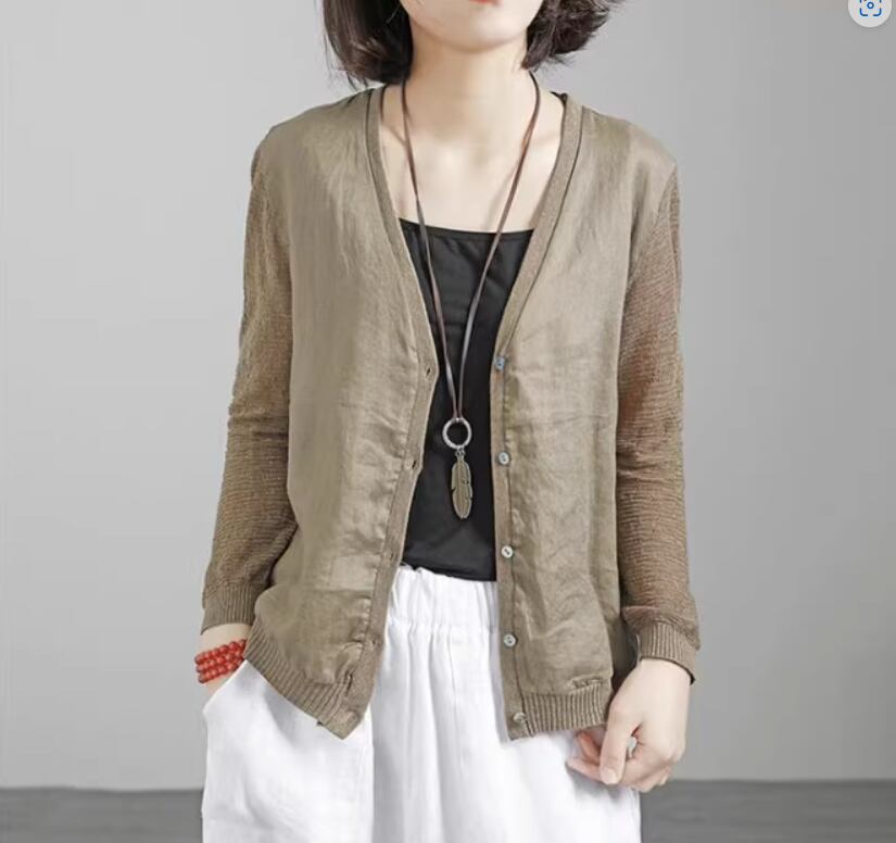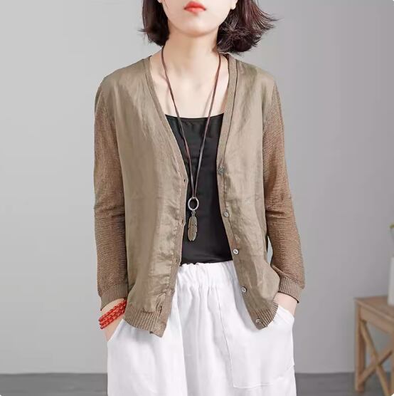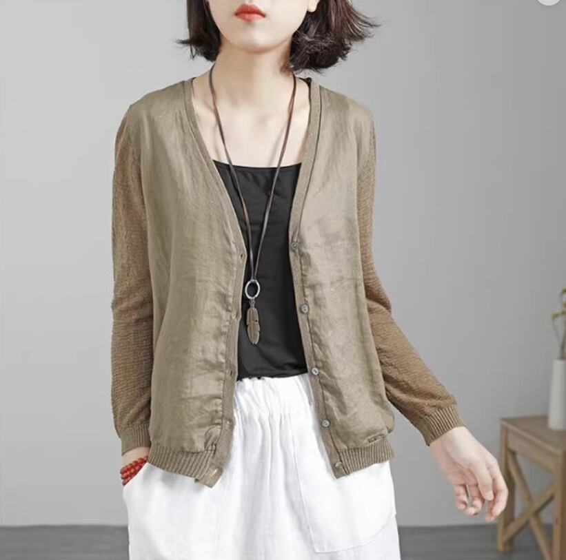 トップス カーディガン 袖あり 長袖 Vネック ストレート 切り替えデザイン ドッキング 伸縮性 シンプル カジュアル おしゃれ お洒落 こなれ感 無地 春 夏 秋 10代 20代 30代 40代 50代 60代 レディース 女性用 ママ お出かけ 着回し 普段使い 重ね着 フリーサイズ カーキ アプリコット