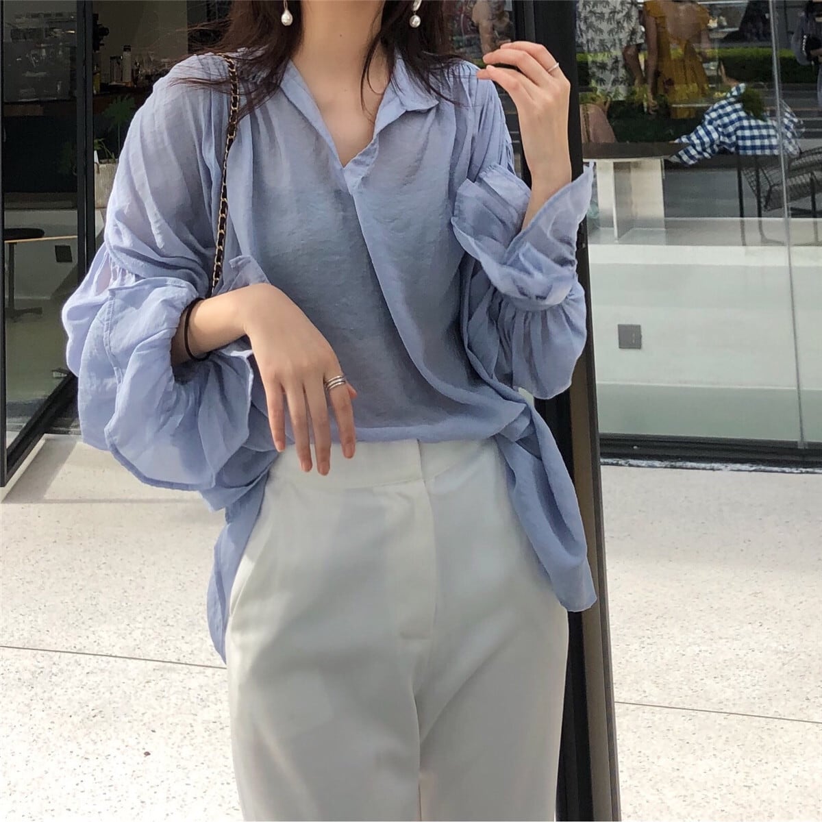 トップス シャツ プルオーバー ミディアム丈 長袖 襟付き シースルー 透け感 薄手 かわいい 大人可愛い きれいめ シンプル 上品 おしゃれ かっこいい カジュアル レトロ きちんと こなれ感 個性的 主役級 存在感 抜け感 オールシーズン ナチュラル ベーシック メンズライク 無地 レディース 女性用 ママ OL 通勤 学オフィス 学生 通学 デート お出かけ お泊まり イベント 女子会 休日 アウトドア カフェ ショッピング レストラン コンパ レイヤード 重ね着 普段使い 着回し ワンサイズ
