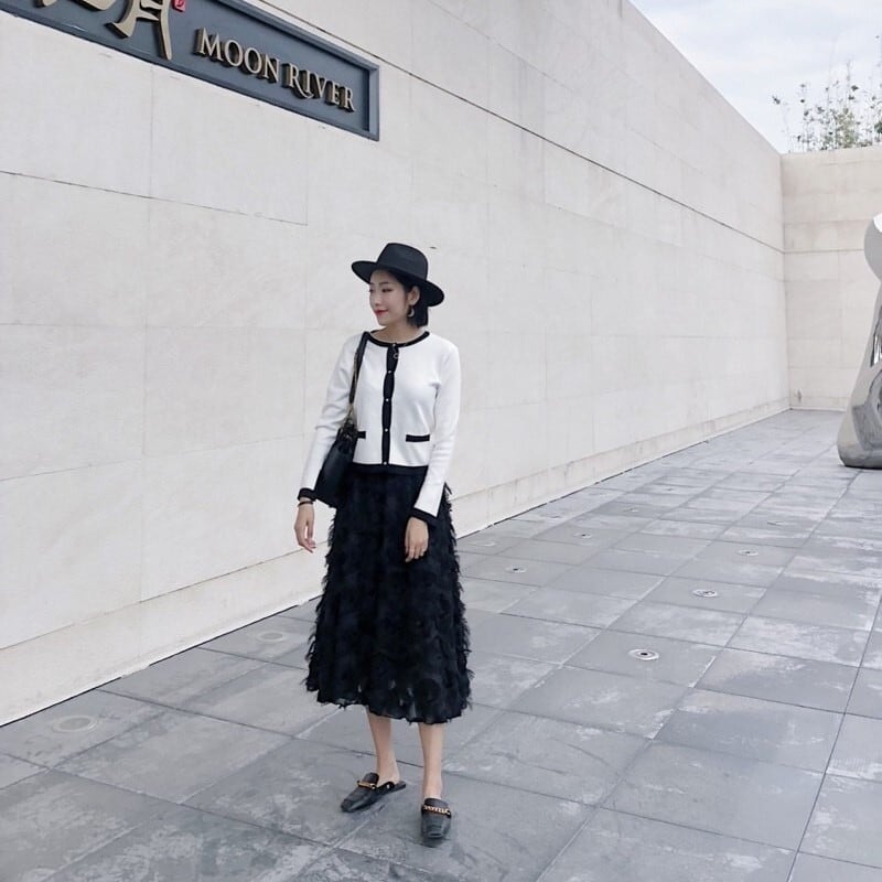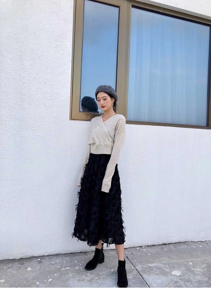 透け感のあるチュールが、ふんわりとした軽やかさを演出し、フェザーのように配置されたフリンジが装いに遊び心を添えます。