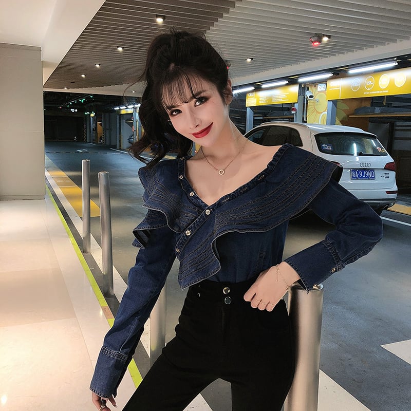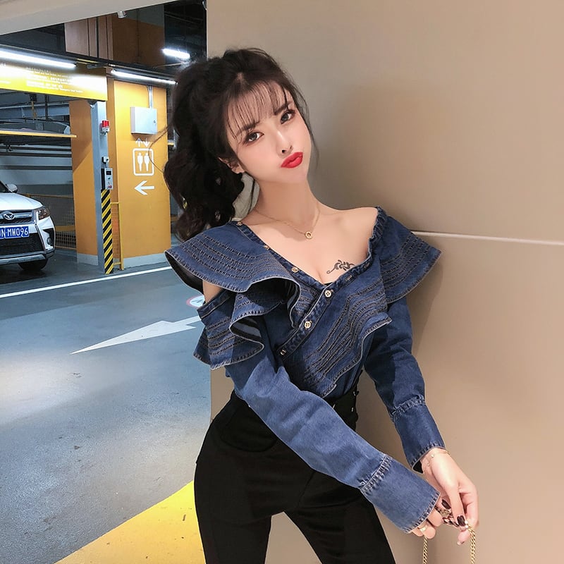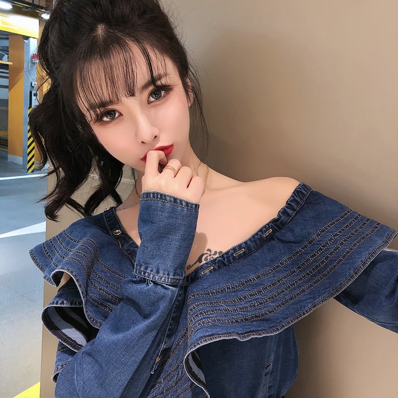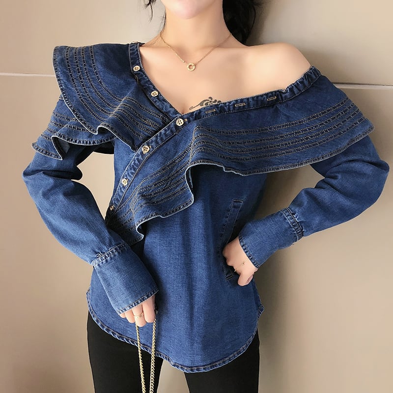 トップス シャツ デニムシャツ ミディアム丈 長袖 ワンショルダー ビックカラー アシンメトリー デニム かわいい 大人可愛い きれいめ シンプル 上品 おしゃれ かっこいい カジュアル レトロ きちんと こなれ感 個性的 主役級 存在感 抜け感 秋 冬 ナチュラル ベーシック キュート ガーリー クール 無地 レディース 女性用 OL 通勤 学生 通学 デート お出かけ お泊まり イベント 女子会 休日 カフェ ショッピング レストラン コンパ レイヤード 重ね着 普段使い 着回し S M L XL